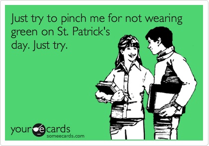 My family isn’t Irish, my parents were teetotalers, to my knowledge my mom has never cooked cabbage — and we never celebrated St. Patrick’s Day when I was growing up. The only thing I knew for SURE about St. Paddy’s Day was if I didn’t wear green to school, I was going to get pinched. I didn’t know why at the time, but apparently St. Patrick’s Day revelers thought wearing green made them invisible to leprechauns, who would pinch anyone they could see (those not wearing green). I never liked this practice, but didn’t feel I could argue about a holiday tradition I knew nothing about. I’m not as easy a mark now as I was as a kid, so I defy anyone to try to pinch me (unless I express an interest!), whether I’m wearing green or not. But I’ll probably wear green just to be on the safe side.