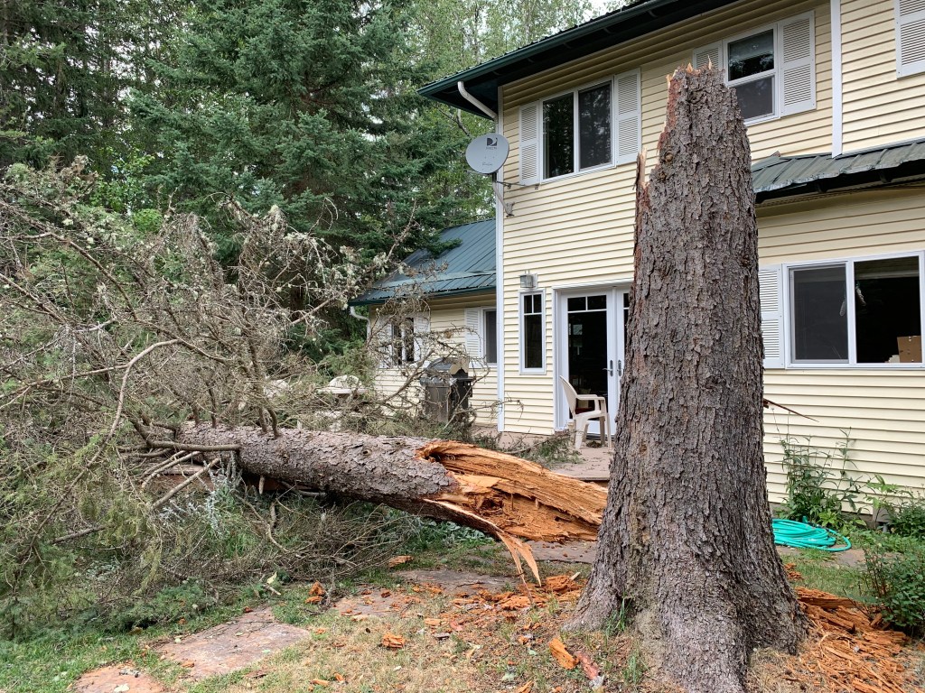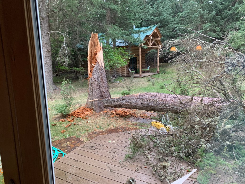 Fifteen minutes later, the worst recorded storm in the valley had blown through. Winds topped eighty miles an hour on the valley floor and reached one-twenty on top of the mountains behind our house. We only lost a handful of trees, partly because more than thirty of the more vulnerable trees had come down in previous storms. (This big Engleman spruce hit the deck later in the summer.) And of course, we lost power.