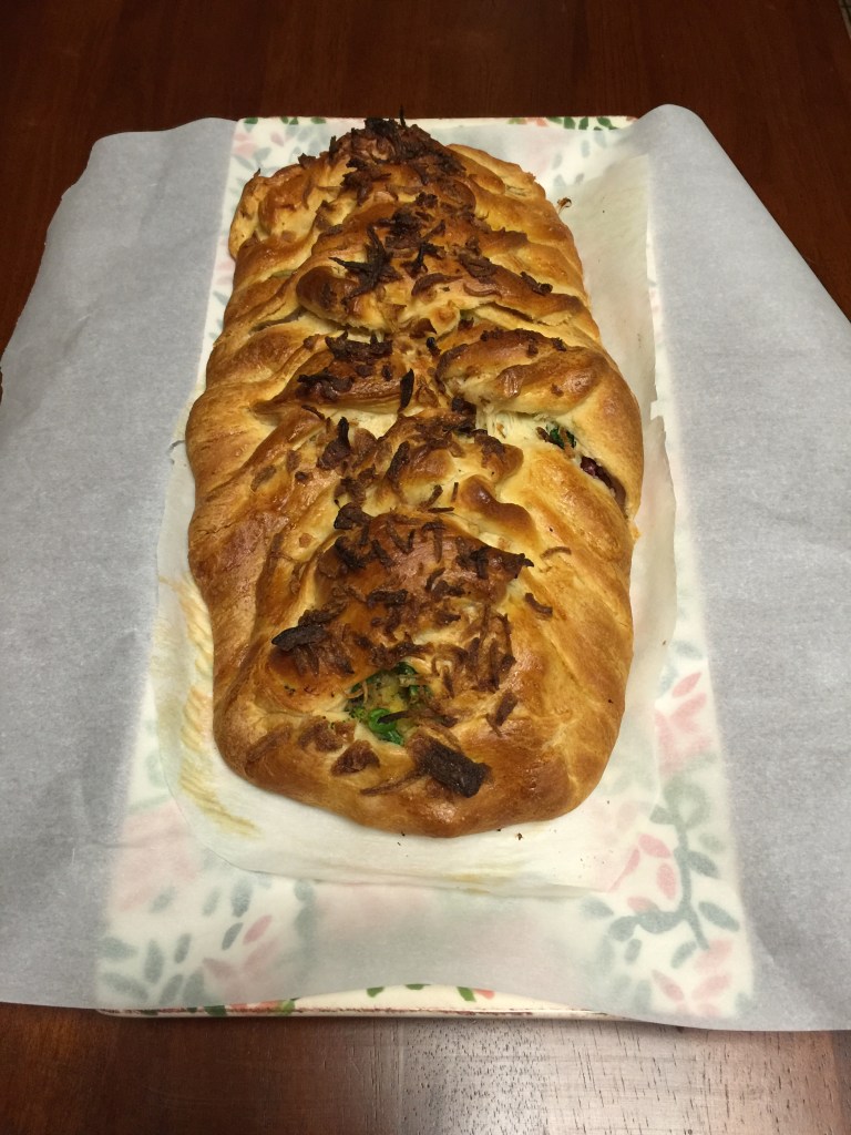 To braid the dough, lift the first two strips across from each other so that they meet in the center, twist each strip once, and then lay them both down on the filling. (You may have to pull or pinch the dough a bit to stretch it.) Continue to do this until you’ve twisted all the strips. Don’t worry if it doesn’t look perfect. Tuck the ends of the braid up to seal it on both ends. Brush the braid with the egg white, and sprinkle with the French-fried onions.