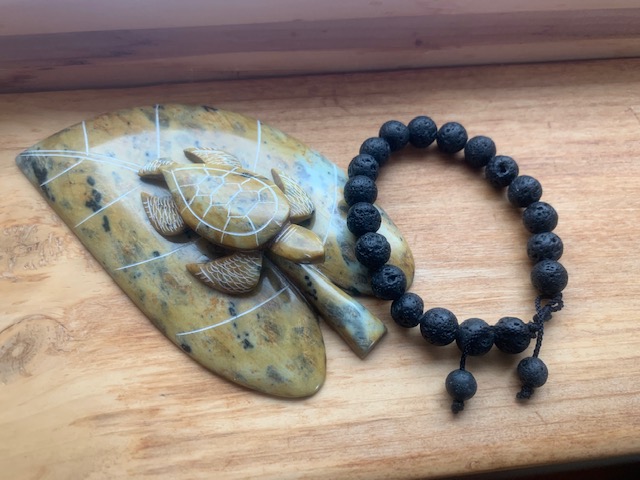 My only other purchases, other than a huge, magenta sunhat was a carved turtle (the vendor at the beach claimed his grandfather had taught the art of carving to him—the grandfather seemed to have many, many beloved grandchildren, but that’s okay) and a “lava rock” bracelet. Now, I don’t know if these beads are really made from lava. But the vendor set it on fire with a lighter to show me how well it held up. I was quite fascinated.