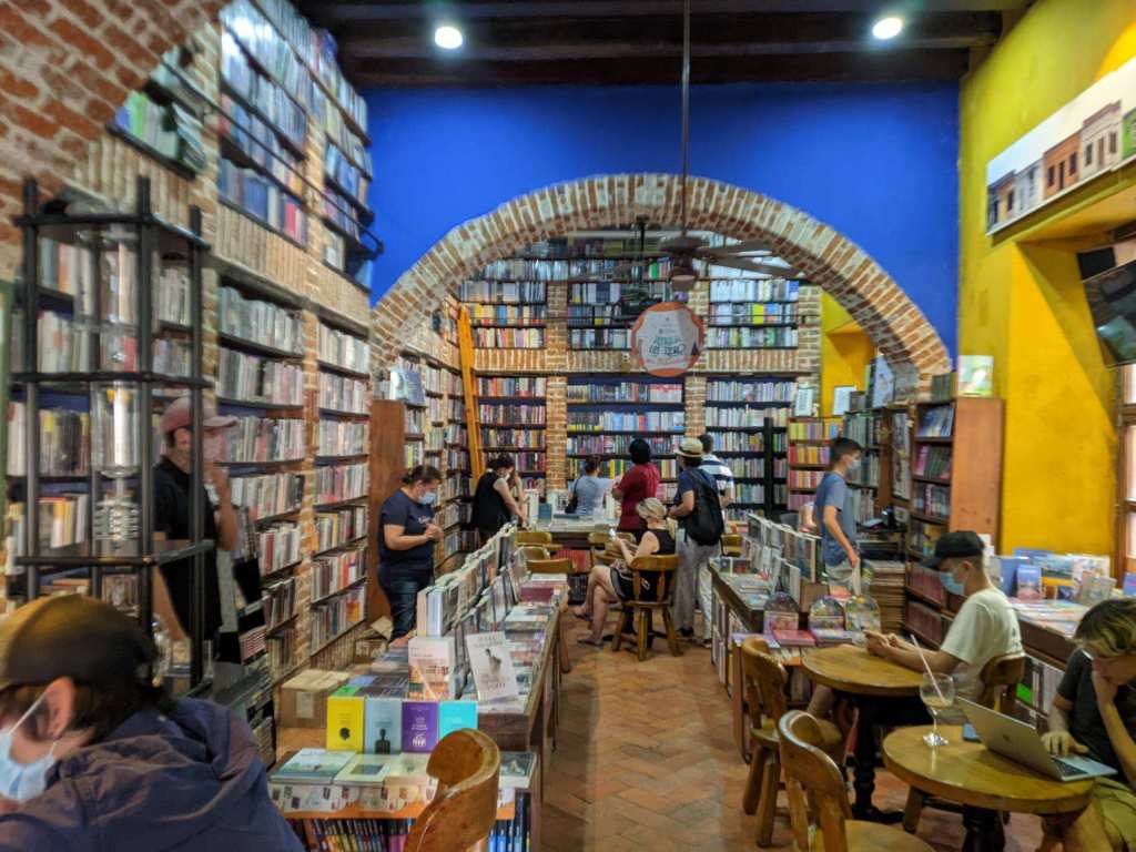 Naturally, I quickly zeroed in on the bookstore. It was so beautiful—and in addition to books (a great mystery section, by the way!) and strong A/C, it offered beer, wine, coffee, and frosted chocolate cake. I’m including a photo of my book purchase—and yes, I plan to read it in Spanish! May take me a while, though).