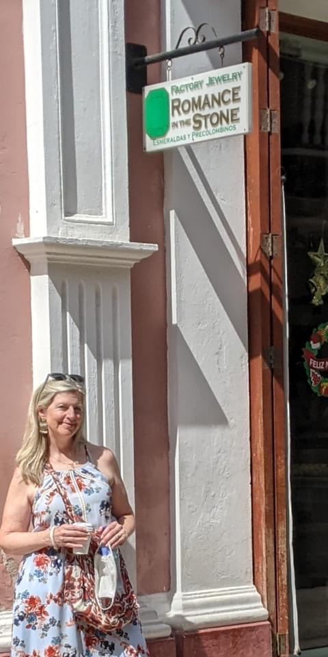 A few words on Joan Wilder (the heroine of Romancing the Stone, 1984, set partly in Cartagena): Sad to say, no mystery fans said, “Lisa Q. Mathews? THE Lisa Q. Mathews? Ah well. But one vendor did call “Joan Wilder” to me—because I posed for a photo outside a place where they sold emeralds. (Note the sign wording way above my head.) I did buy one Joan Wilder-approved, off-the-shoulder dress that I may wear to some future writers conference banquet. And my husband surprised me with an emerald-ish necklace for Christmas. It is beautiful.