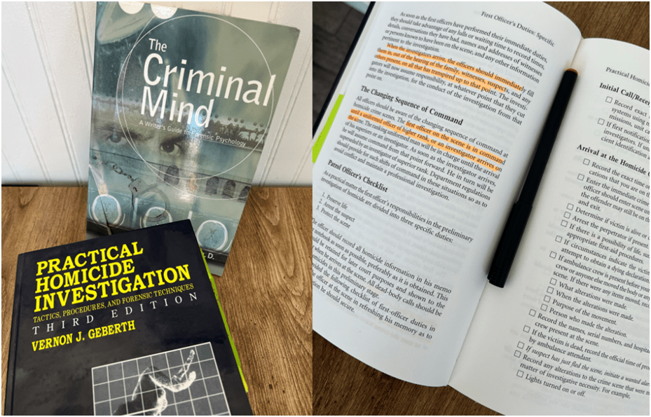 Since I write about homicide investigations, my bookshelf contains Vernon J. Geberth’s “Practical Homicide Investigation” (2000), a book expressly written for working homicide detectives. I use the techniques within to create verisimilitude in my fiction. I don’t stop at police and detective manuals.  To get into the mind of the killer, I have books such as “The Criminal Mind: A Writer’s Guide to Forensic Psychology” (2002) by Katherine Ramsland, Ph.D. as well as several others.