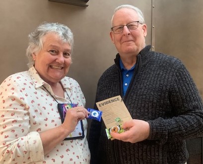Speaking of Bolo Books, here is a pic of Kristopher’s hubby Michael Meuller with DonnaRae Menard in the lobby. I wanted Michael to show you the cool evidence bag swag he created. And DonnaRae, thank you for that delicious fresh-raspberry Danish. I enjoyed a piece every morning!