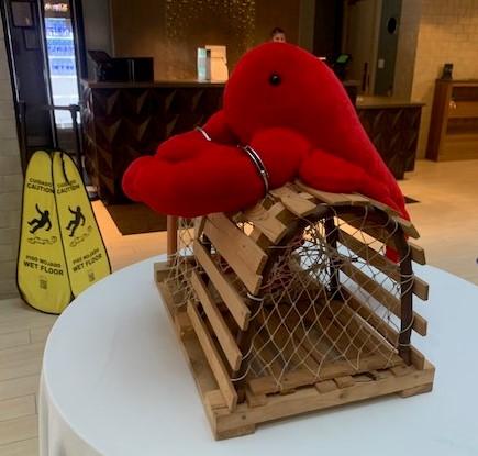 This is our lobster mascot in cuffs (doesn’t that danger sign behind him look sort of like a crime scene?). Allegedly, his name is Larry. No one is quite sure.