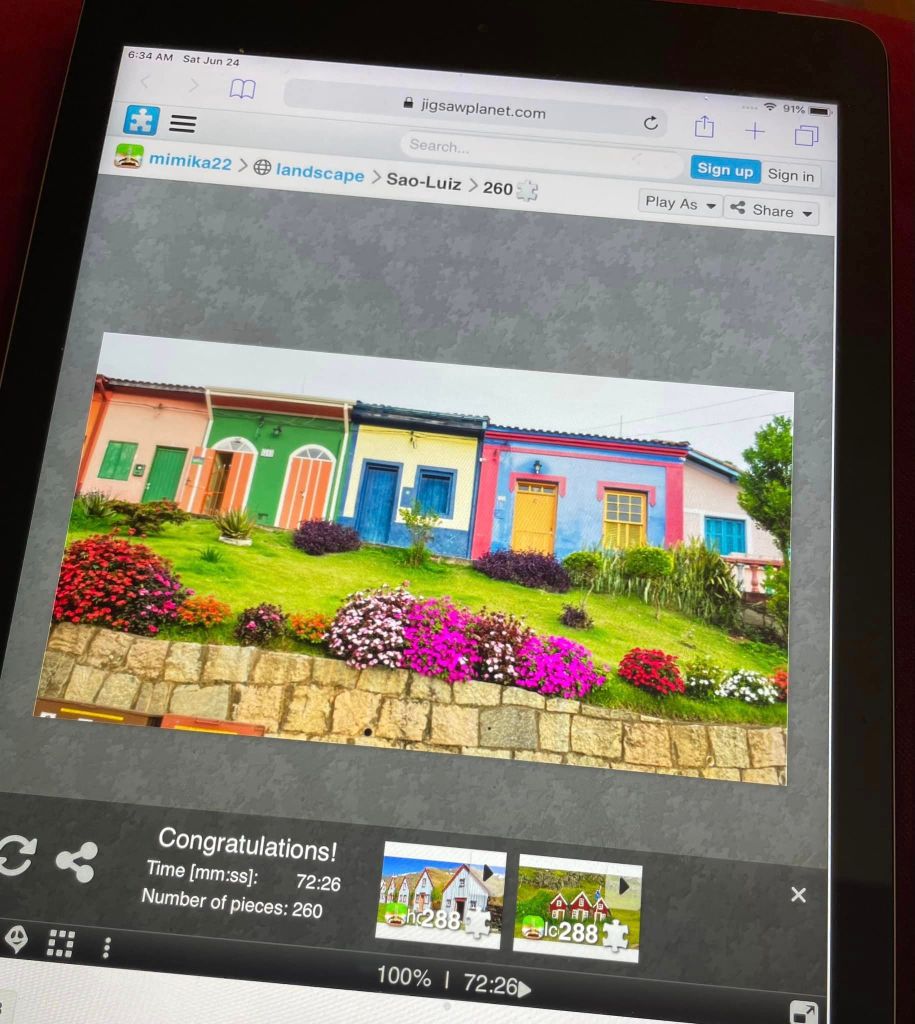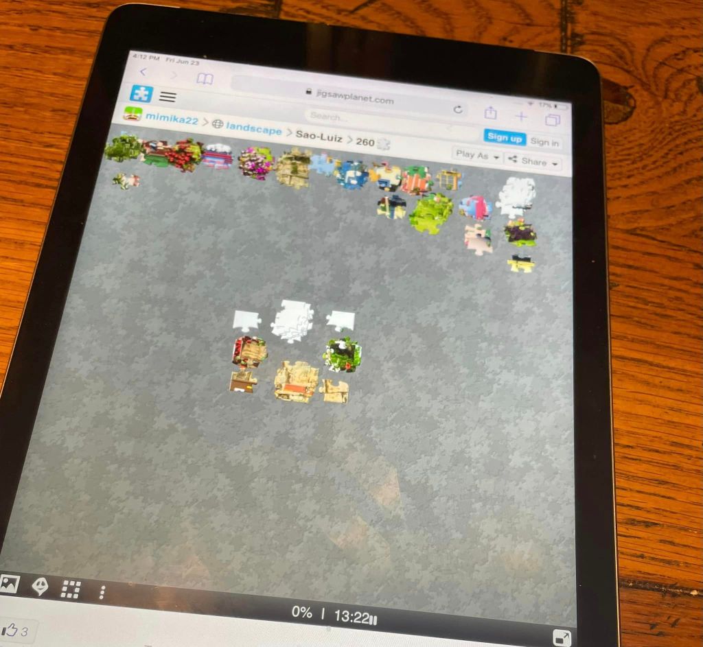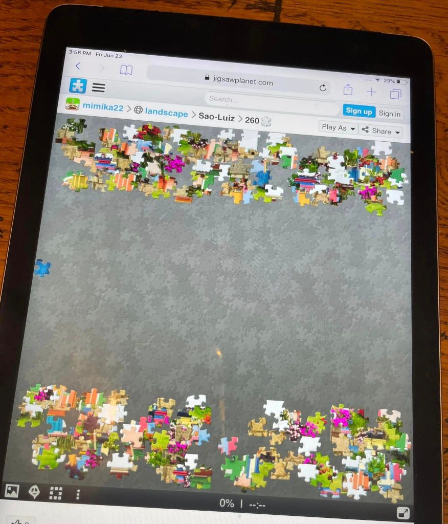 I have recently discovered my love for jigsaw puzzles. Well, technically, I’ve always liked jigsaws, but haven’t done them since I was a kid when my mom would set up the card table and dump out a box. What changed was I found an online app—Jigsaw Planet—that is perfect for my iPad.
