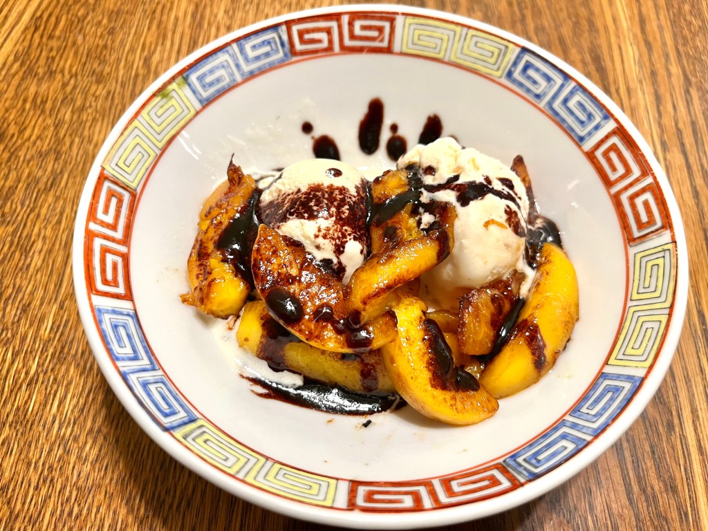 If you’re going to be grilling your dinner anyway, it’s easy to simply throw on some peach halves after the main course is cooked, to allow their sugar to caramelize with beautiful grate marks and for them to take on a lovely smoky flavor. Once grilled, the peaches can be kept warm in the oven until time for dessert, then served with a rich vanilla ice cream and drizzled with this flavorful balsamic reduction.