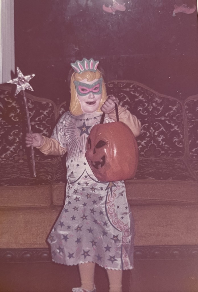 I have very few memories of Halloween costumes from my childhood, don’t ask me why. Halloween spooked me too much. But I do remember one beautiful pink satin princess costume my mom made me, with a shawl of the same fabric. Very streamlined 60s style. I remember mostly because there was a pic of me – the only Halloween one ever – and my mother pulled my hair into a bun so tight I still remember how much it hurt.