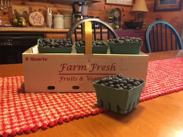 As I drove up to the quaint, American-flag-draped barn, there were neither berries nor customers in sight. But as I snapped a few farm pictures in the ninety-degree heat, a guy appeared with an armload of baskets. I could start picking in a field a mile or two further down. Wait, what? Luckily, it turned out he also had several pints of beautiful, very blue berries back in the barn. I thanked him profusely and promised to return the baskets ASAP.