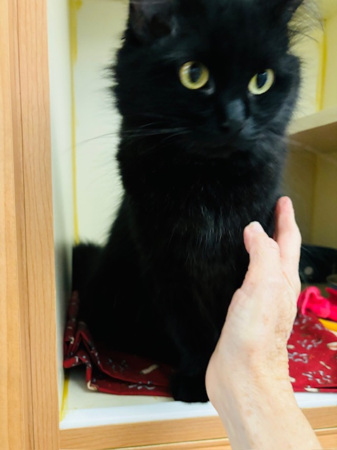 I was off to Pope Memorial like a shot on the next adoption day, arriving 20 minutes early. I sat on a bench outside, waiting for the doors to open. I knew I had to be first in line for such a sweet, adorable cat. Sure enough, there she was, waiting right at the glass door of a cat condo about eye-level to me, the first kitty I spotted. Here’s a photo of me reaching out to pet her. She nuzzled up and I burst into tears.
