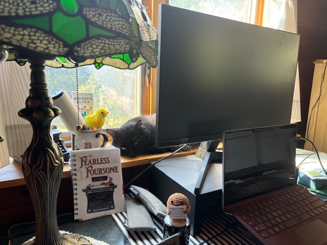 Lisa here, furiously writing—and welcoming a new furry writing companion: a little black cat who flew all the way from Texas to New Hampshire via feline rescue transport. Come say aloha to Aloha!