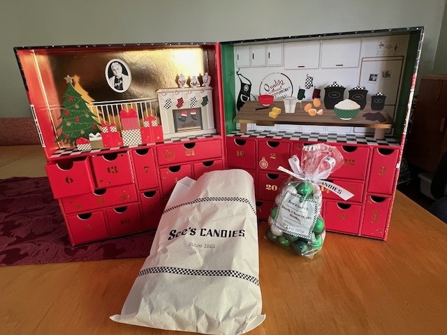 From there, my tastes turn pricier. I indulged in the 2025 See’s calendar, but since I kept the box from last year, I refilled it for my fam.