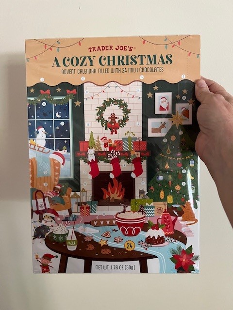 I generally kick things off with the super-economical Trader Joe’s mini chocolates calendar. Look, it’s even “cozy” this year!
