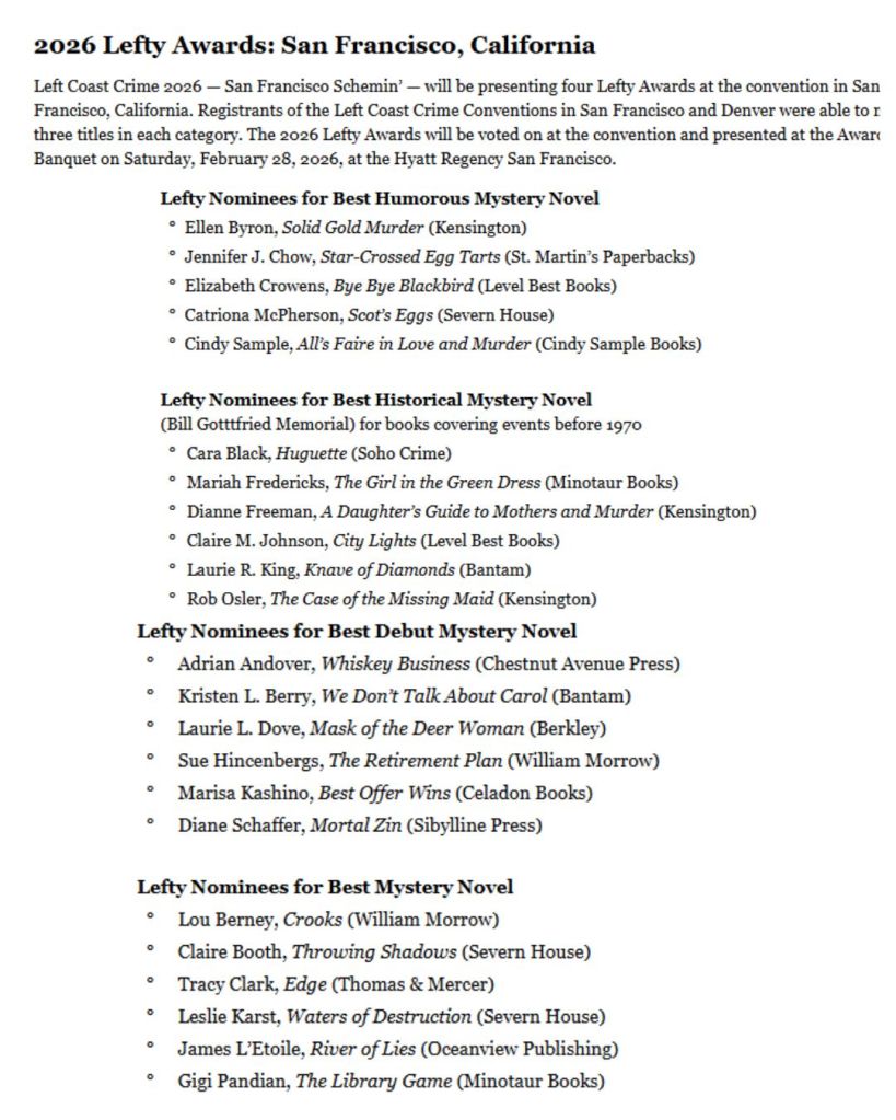 It takes some effort to drag oneself out of bed on the first workday of the new year. But an e-blast from Left Coast Crime made it much easier for a few of our Chicks. Congratulations to Ellen and Jen for Lefty nominations in the category of Best Humorous Mystery and Leslie for a Best Mystery Novel nomination!