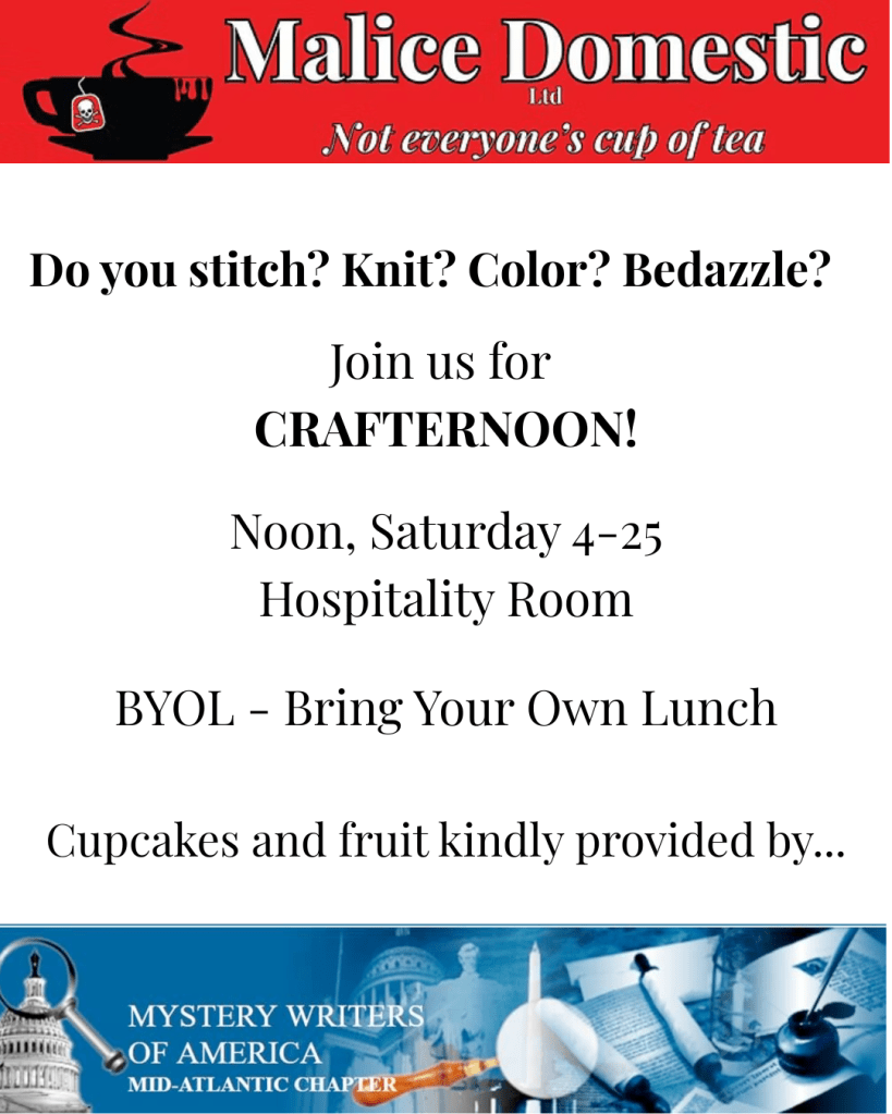 But until then, I’ve come up with an event that will bring readers and authors together at Malice Domestic in April. For the last couple of years, I’ve put invited anyone who stitches or knits or does another type of handiwork to join me in the Hospitality Room at lunchtime on Saturday, where we take a break from the busy con life and hang out while we craft. This year, author Mindy Carlson got in touch with me to say her MWA-Mid-Atlantic chapter would love to provide snacks for the get-together. So, I give you –