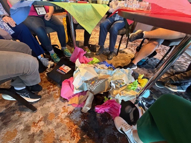 On Thursday, I joined Facebook groupmates Mindy Quigley, Libby Klein, and Raquel V. Reyes for A Very Merry Un-Birthday with the Cozy Mystery Crew, shepherded by Mindy. We played a game that was like with musical chairs but with books wrapped in layers of paper. So much messy fun.